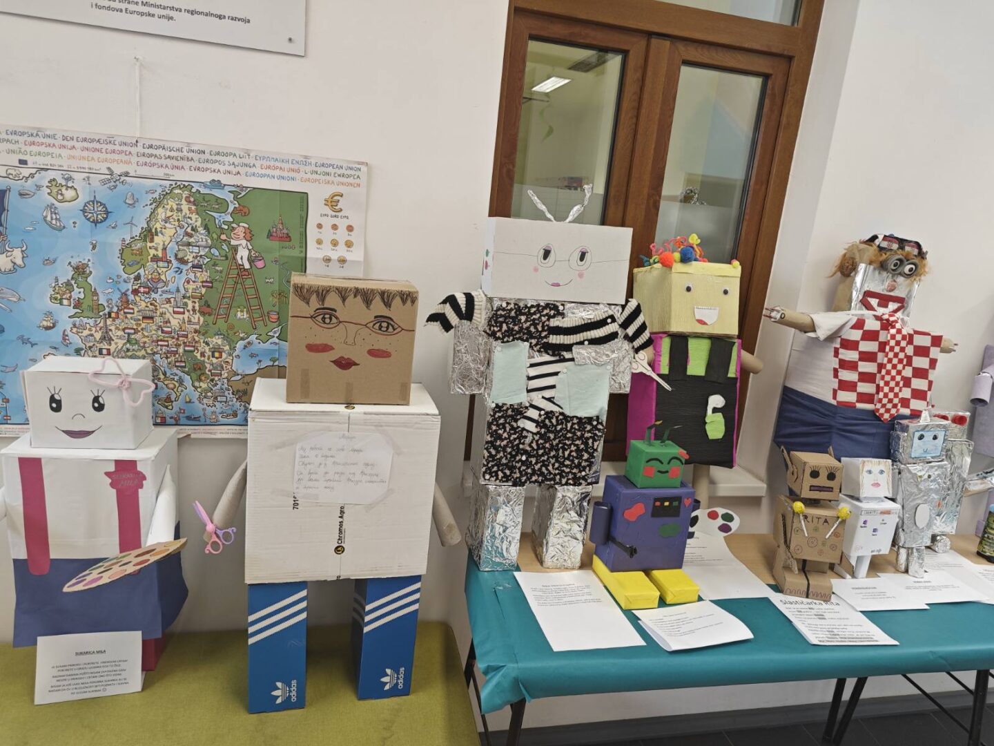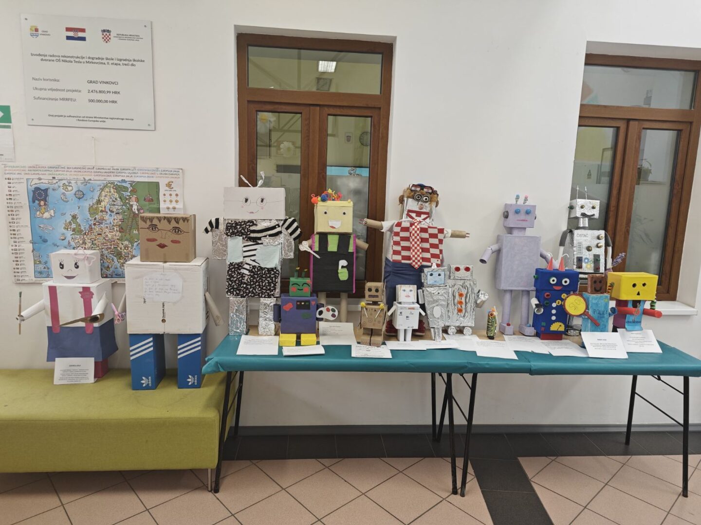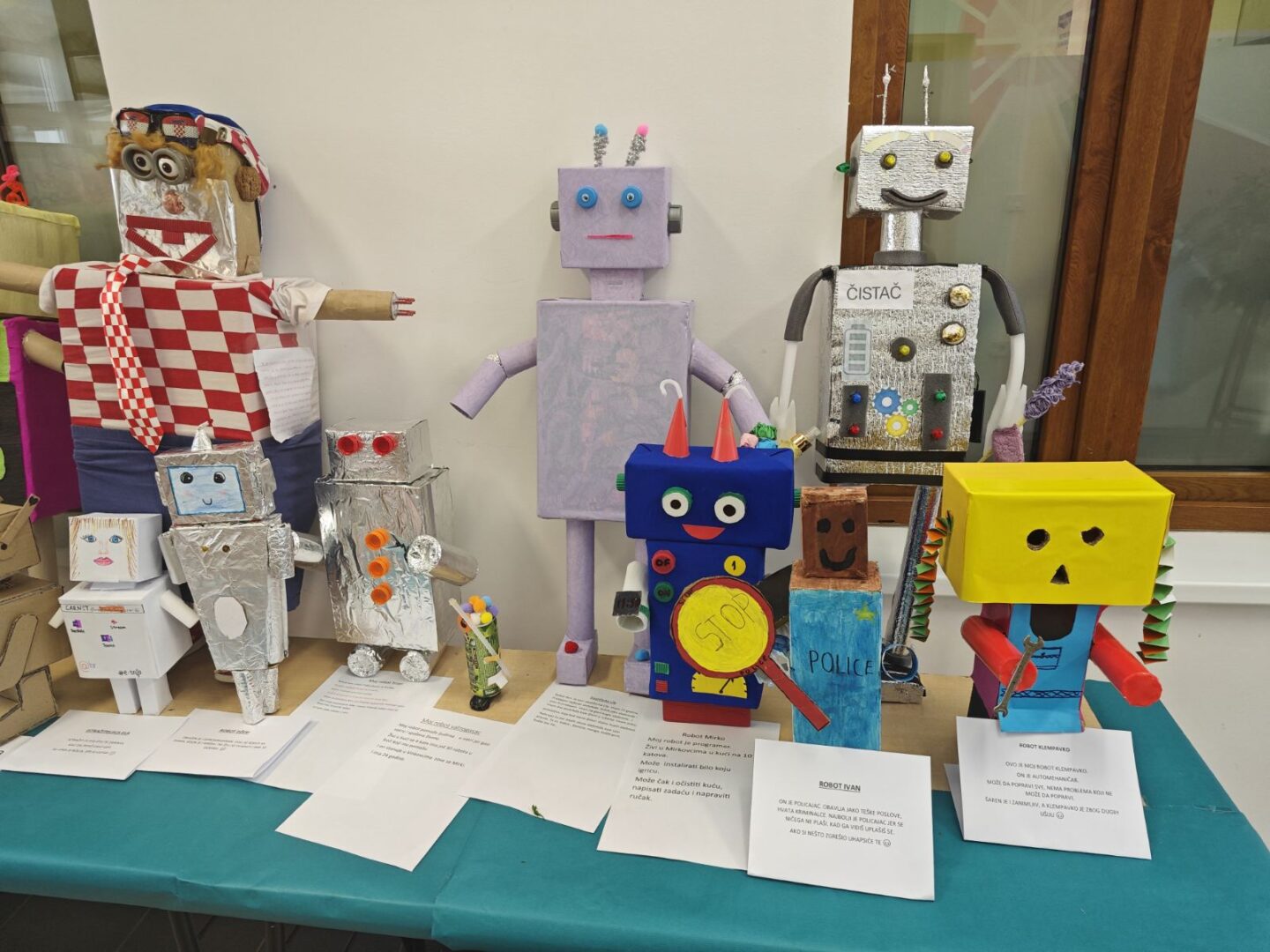 Na nastavi su najprije nacrtali svoje robote, a zatim u programu Word napisali maštovite opise njihovih sposobnosti i osobnosti. Učitelji su ispisali te opise, a učenici ih s ponosom zalijepili uz svoje robote.