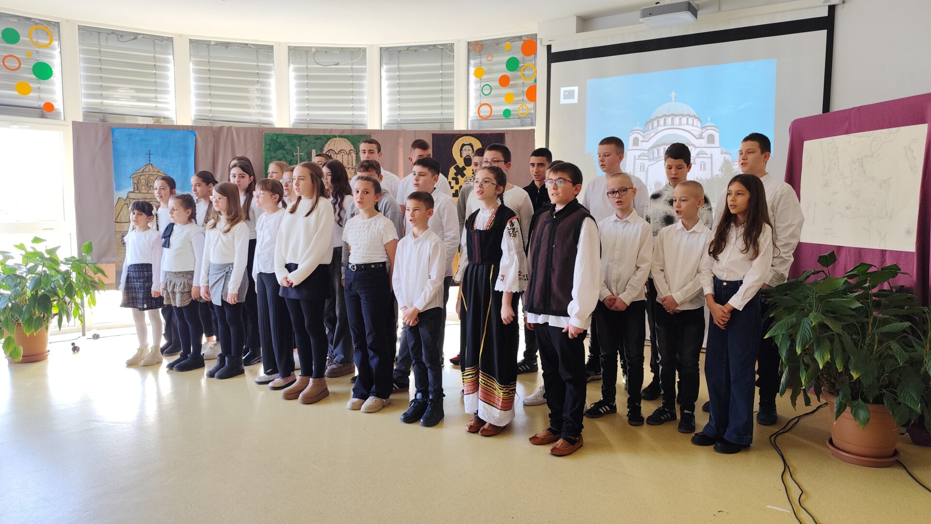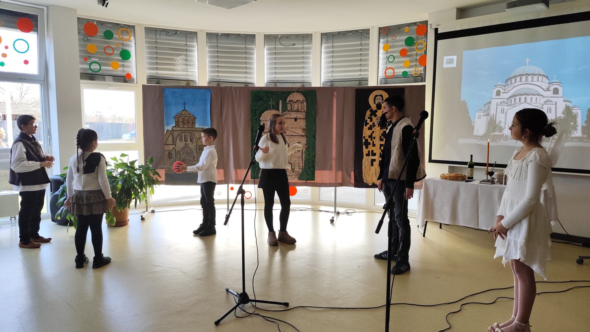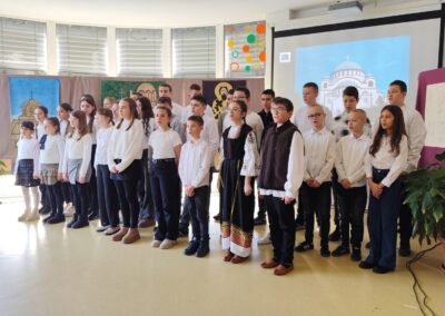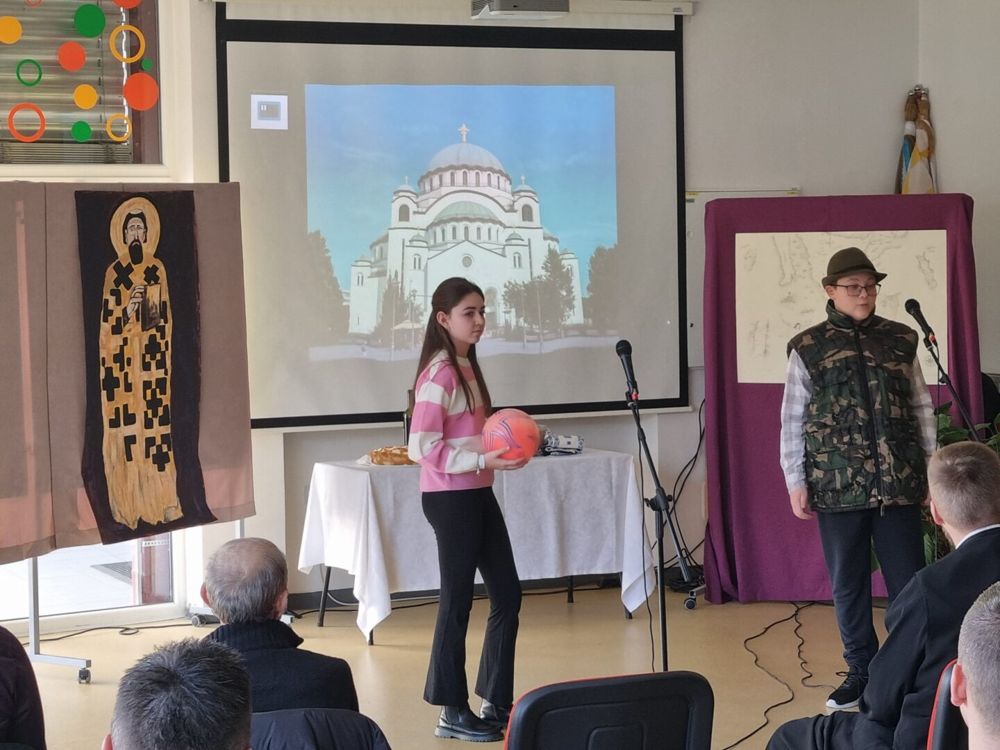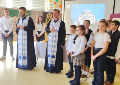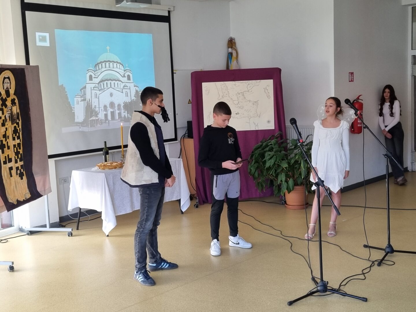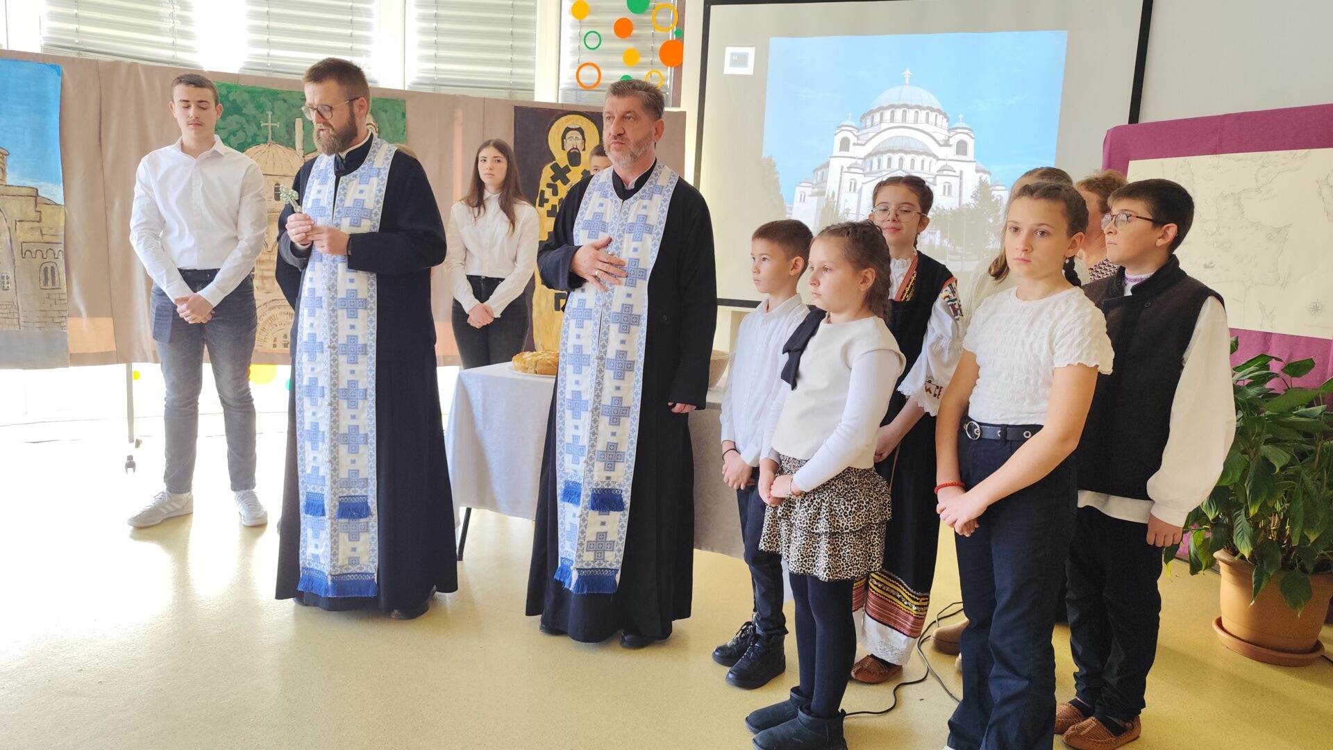 Okupljeni su mogli uživati u odlično pripremljenom programu kolegice Branke Brdarić kojeg su realizirali učenici i učitelji škole, a program je prikazan i na službi u Hramu Svetog oca Nikolaja u Mirkovcima u 16:00 sati. Službu su vodili otac Spasojević i naš vjeroučitelj, otac Lukić.