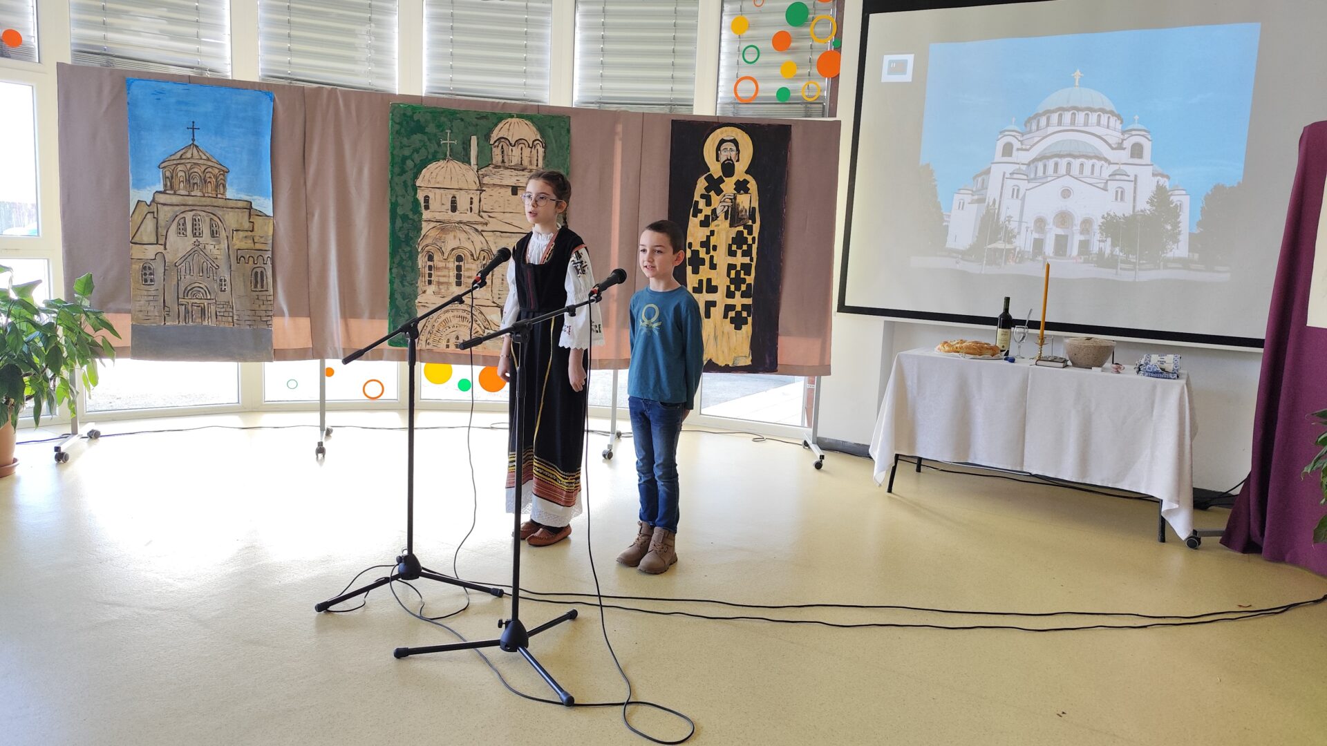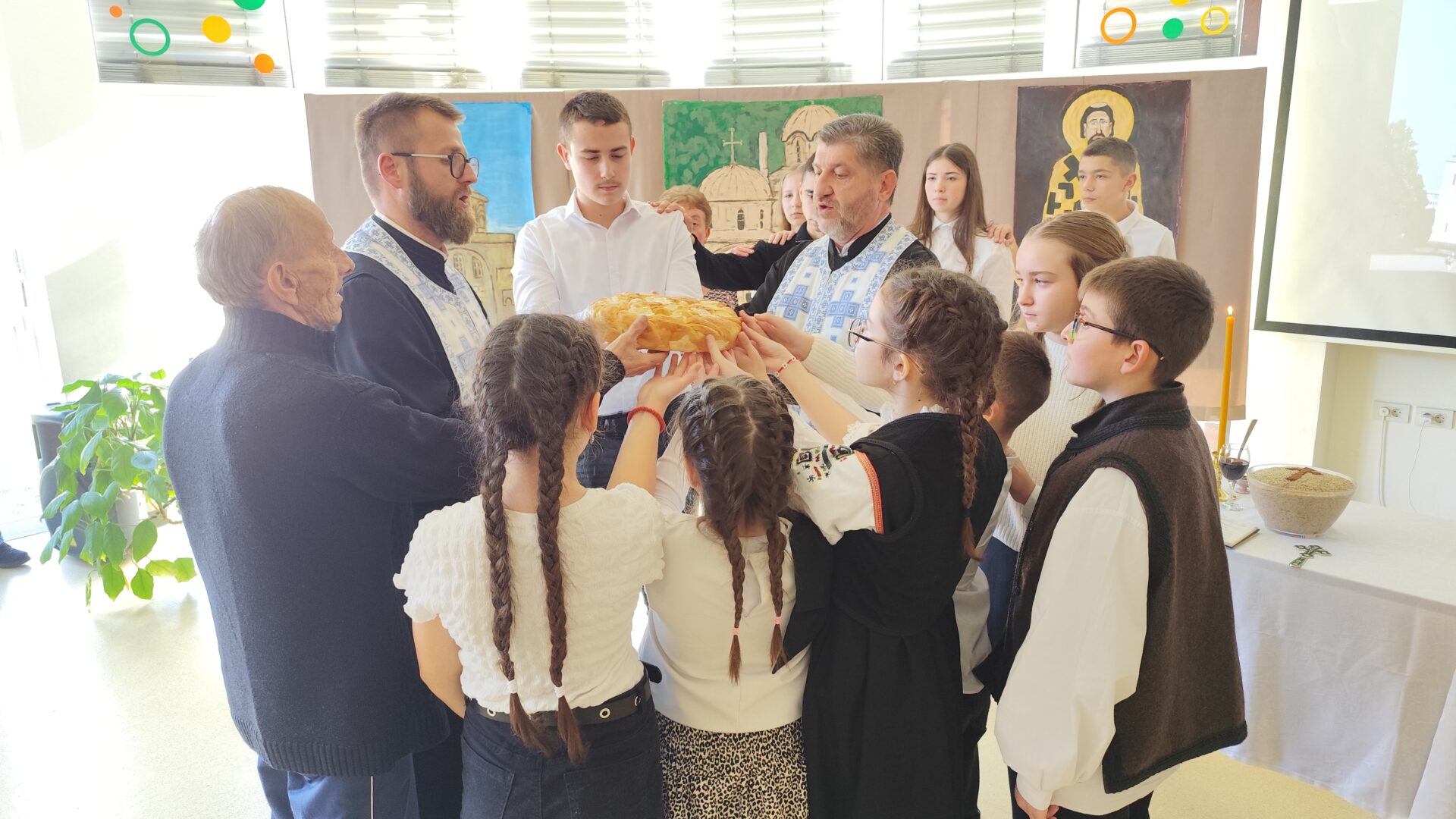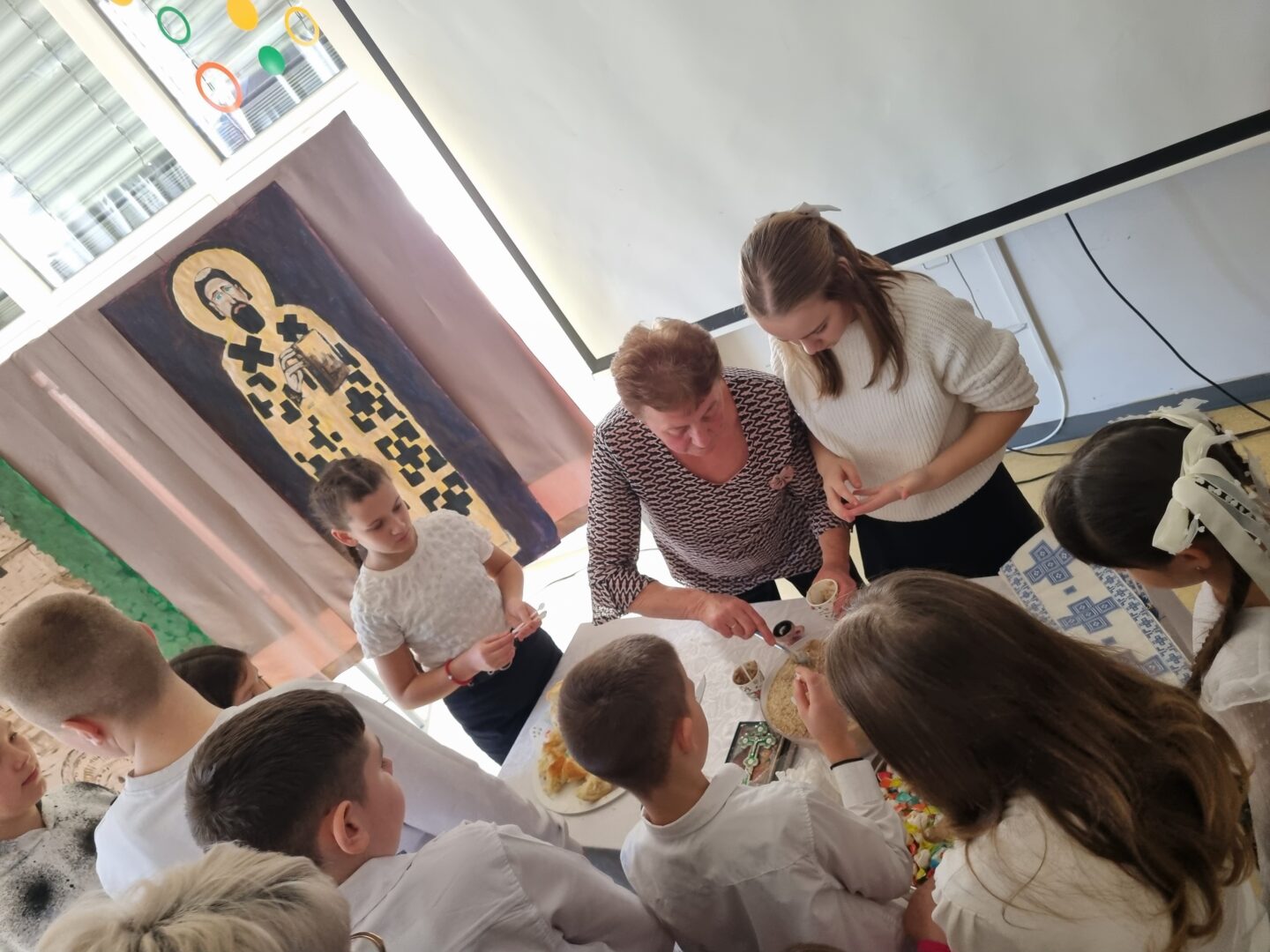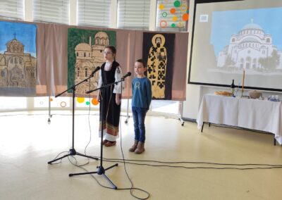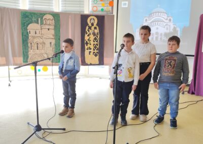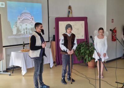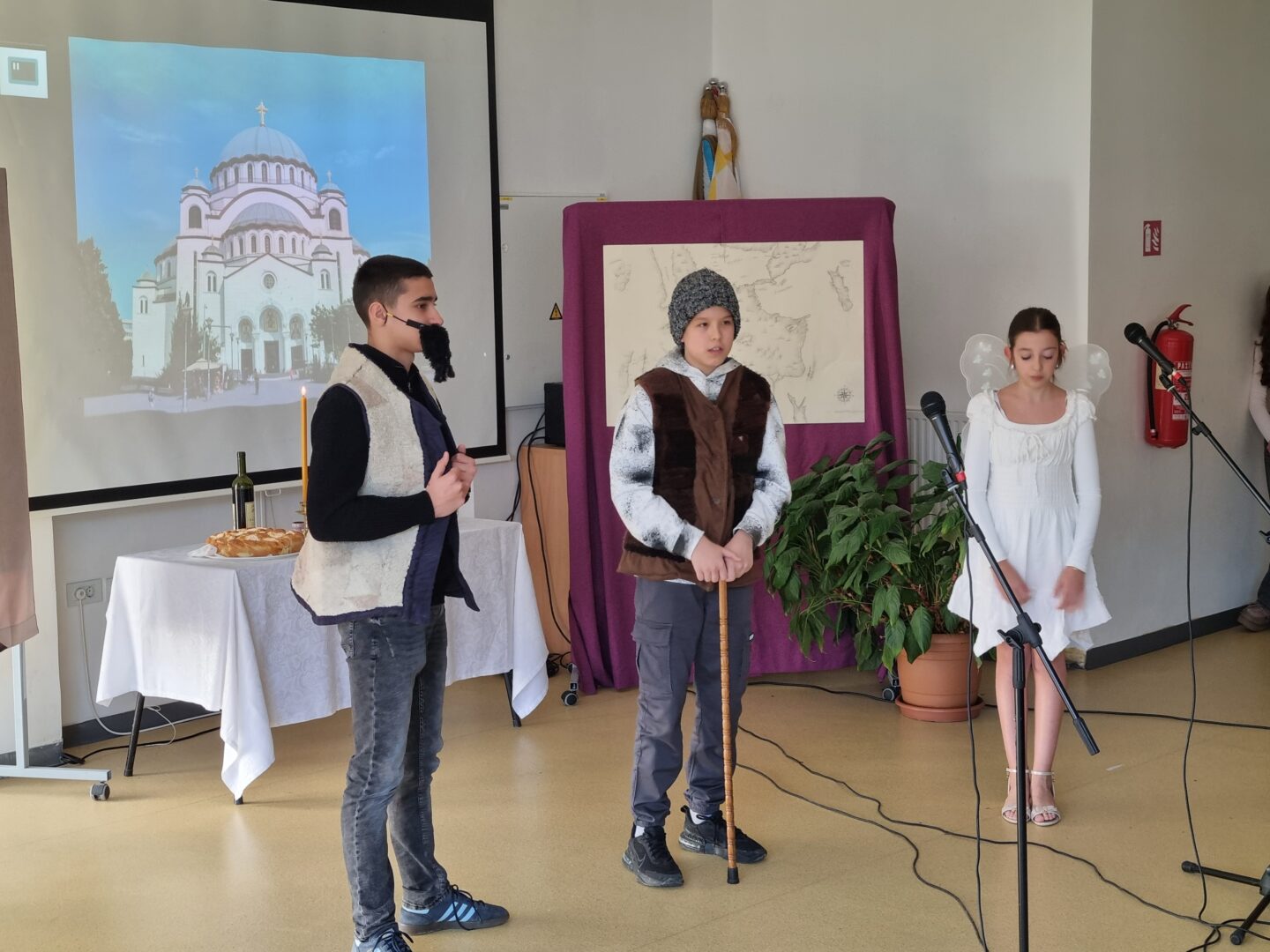 Okupljeni su mogli uživati u odlično pripremljenom programu kolegice Branke Brdarić kojeg su realizirali učenici i učitelji škole, a program je prikazan i na službi u Hramu Svetog oca Nikolaja u Mirkovcima u 16:00 sati. Službu su vodili otac Spasojević i naš vjeroučitelj, otac Lukić.
