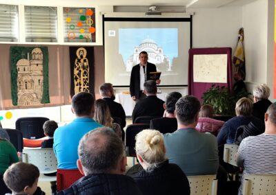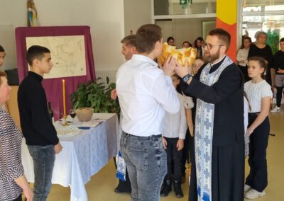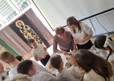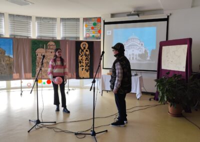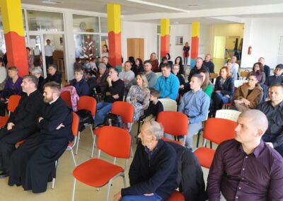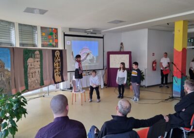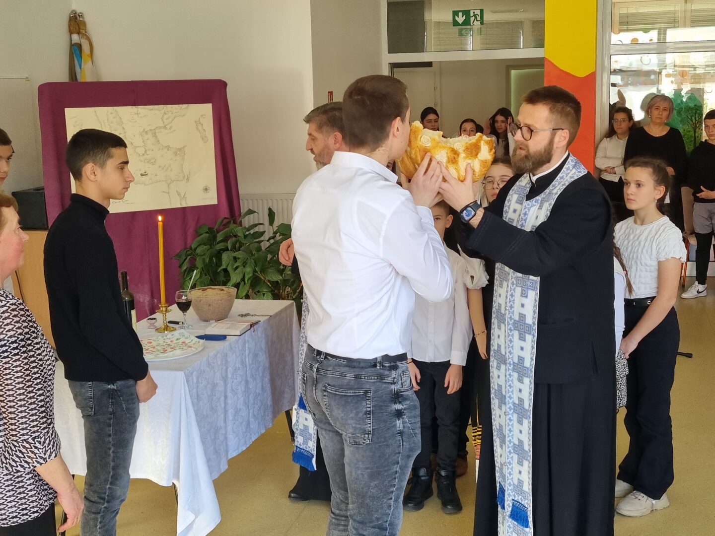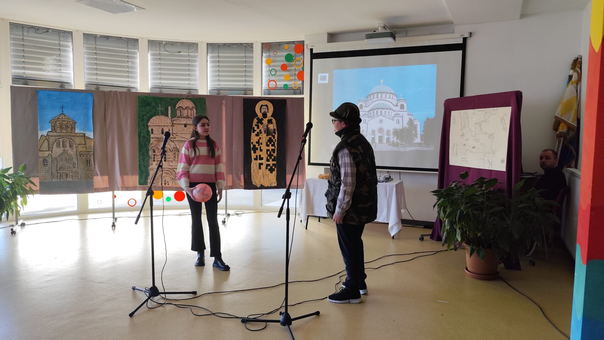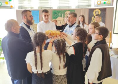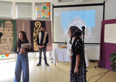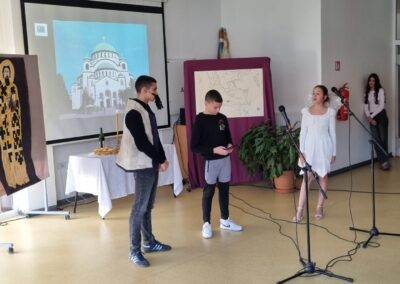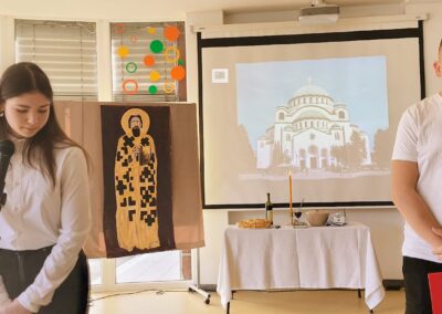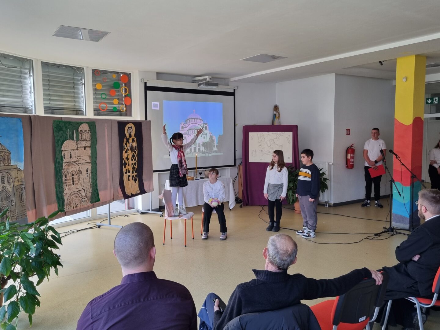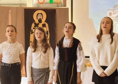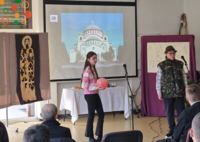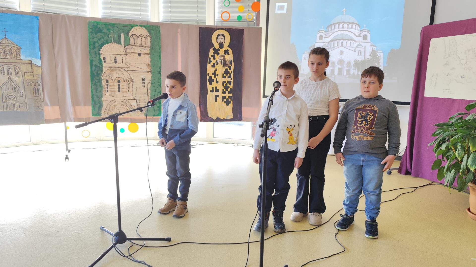 Okupljeni su mogli uživati u odlično pripremljenom programu kolegice Branke Brdarić kojeg su realizirali učenici i učitelji škole, a program je prikazan i na službi u Hramu Svetog oca Nikolaja u Mirkovcima u 16:00 sati. Službu su vodili otac Spasojević i naš vjeroučitelj, otac Lukić.
