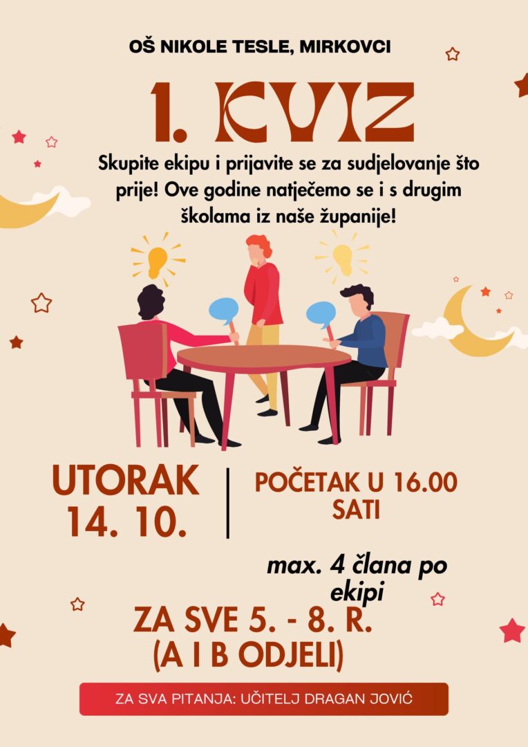 Uskoro počinje druga sezona kviza u našoj školi. Velika je novost kako ćemo ove godine biti dio županijske kviz lige osnovnih škola te ćemo se natjecati međusobno, ali i s ostalim školama Vukovarsko-srijemske županije. Prvi će se kviz održati u utorak 14. listopada 2025. s početkom u 16.00 sati.