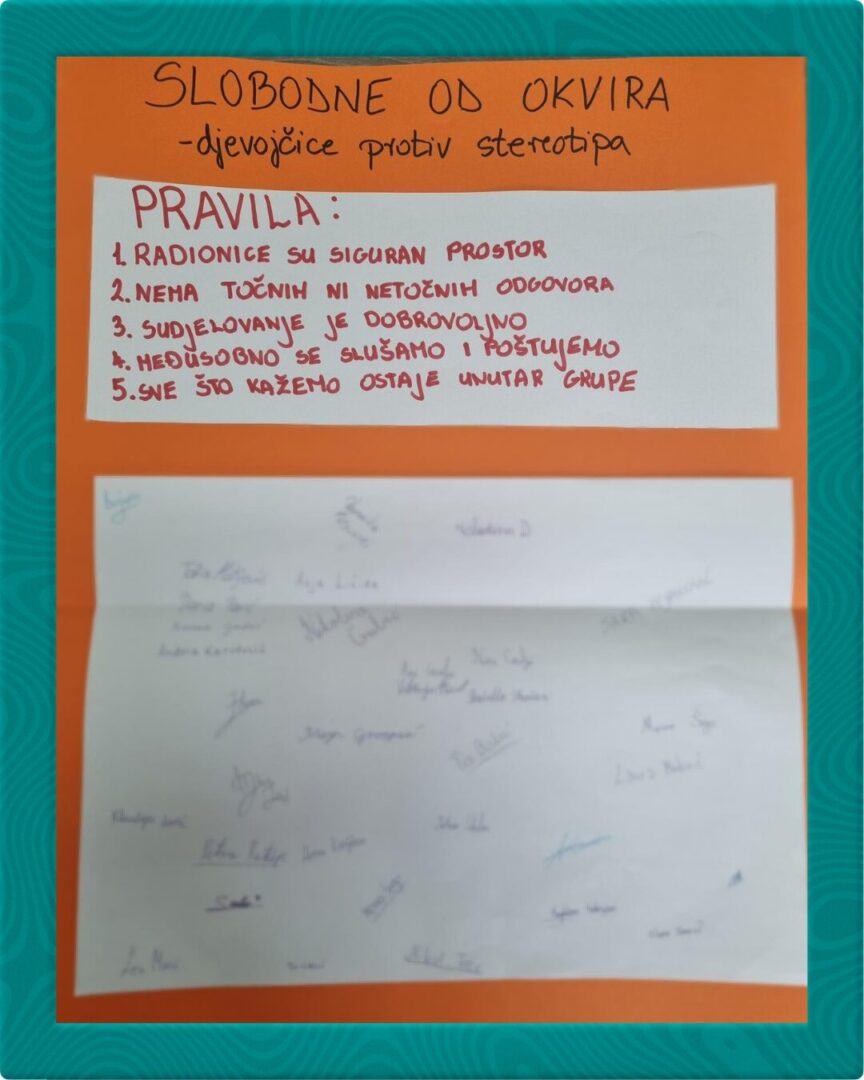 Projekt „Slobodne od okvira- djevojčice protiv stereotipa“  usmjeren je jačanje otpornosti i zaštitu mentalnog zdravlja učenica od 5. do 8. razreda osnovne škole. Kroz ciklus od 10 radionica učenice će razvijati samopouzdanje, pozitivnu sliku o sebi, kritičko promišljanje sadržaja na internetu i društvenim mrežama te socijalne vještine za nenasilno rješavanje sukoba. U projekt se uključuju i njihove majke (u sklopu zajedničkih radionica) te nastavnice (informatika, biologija) i stručne suradnice škole (pedagoginja, knjižničarka).