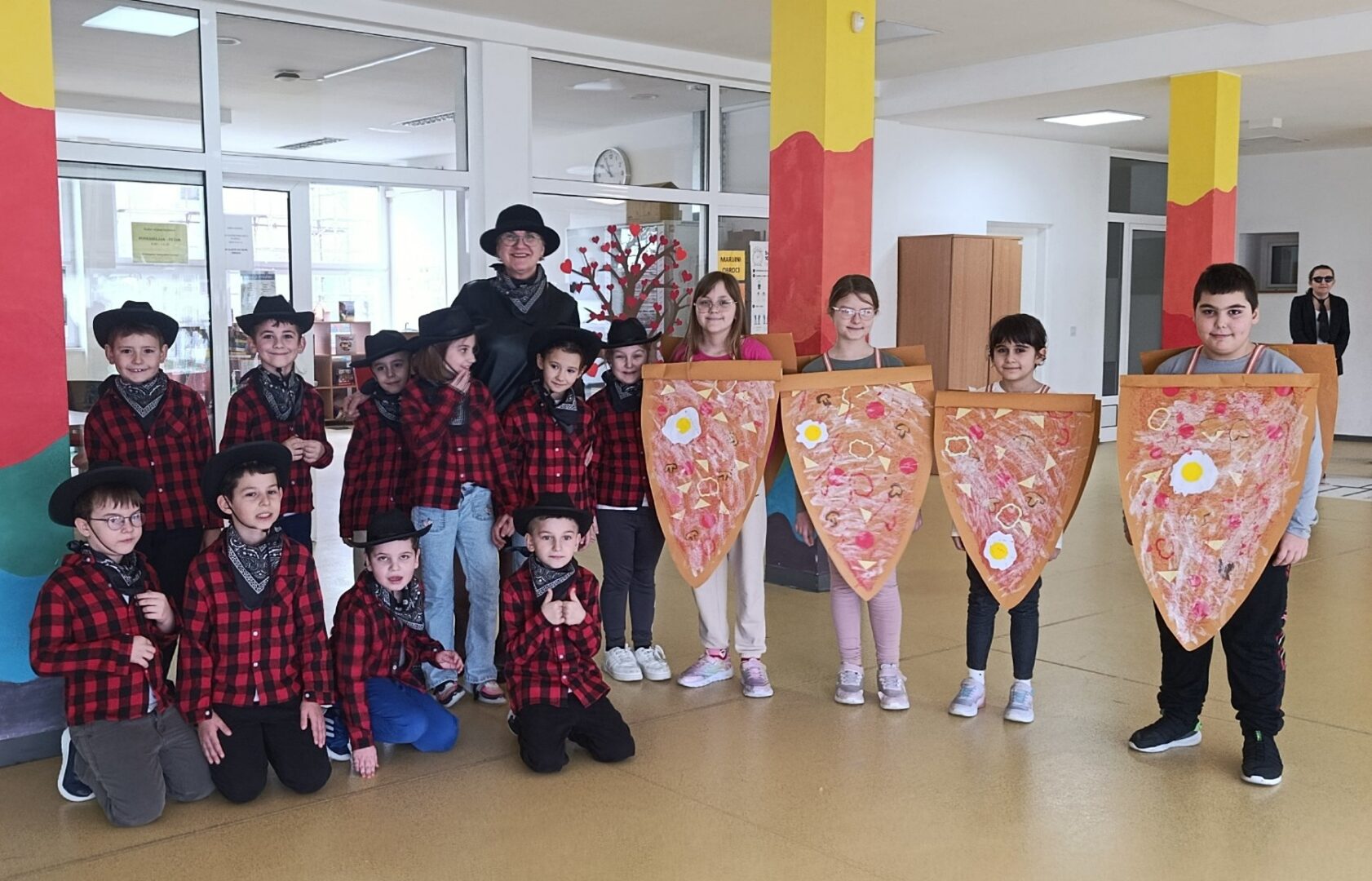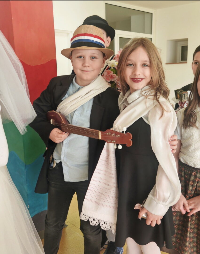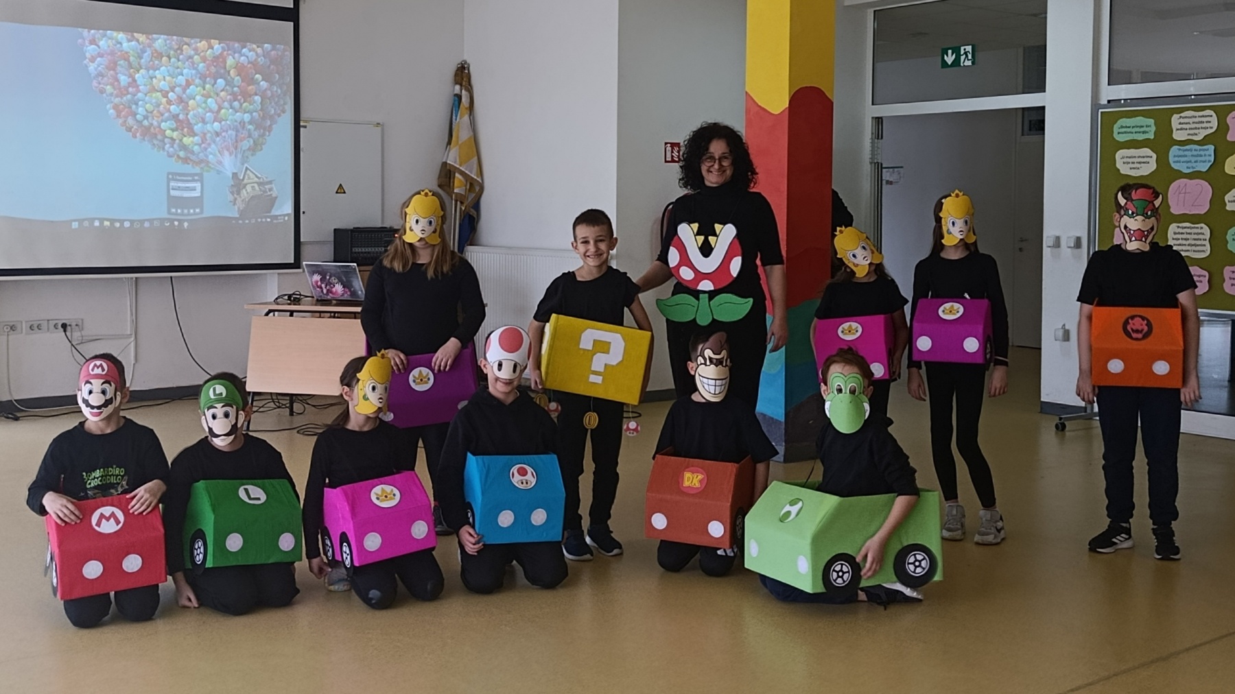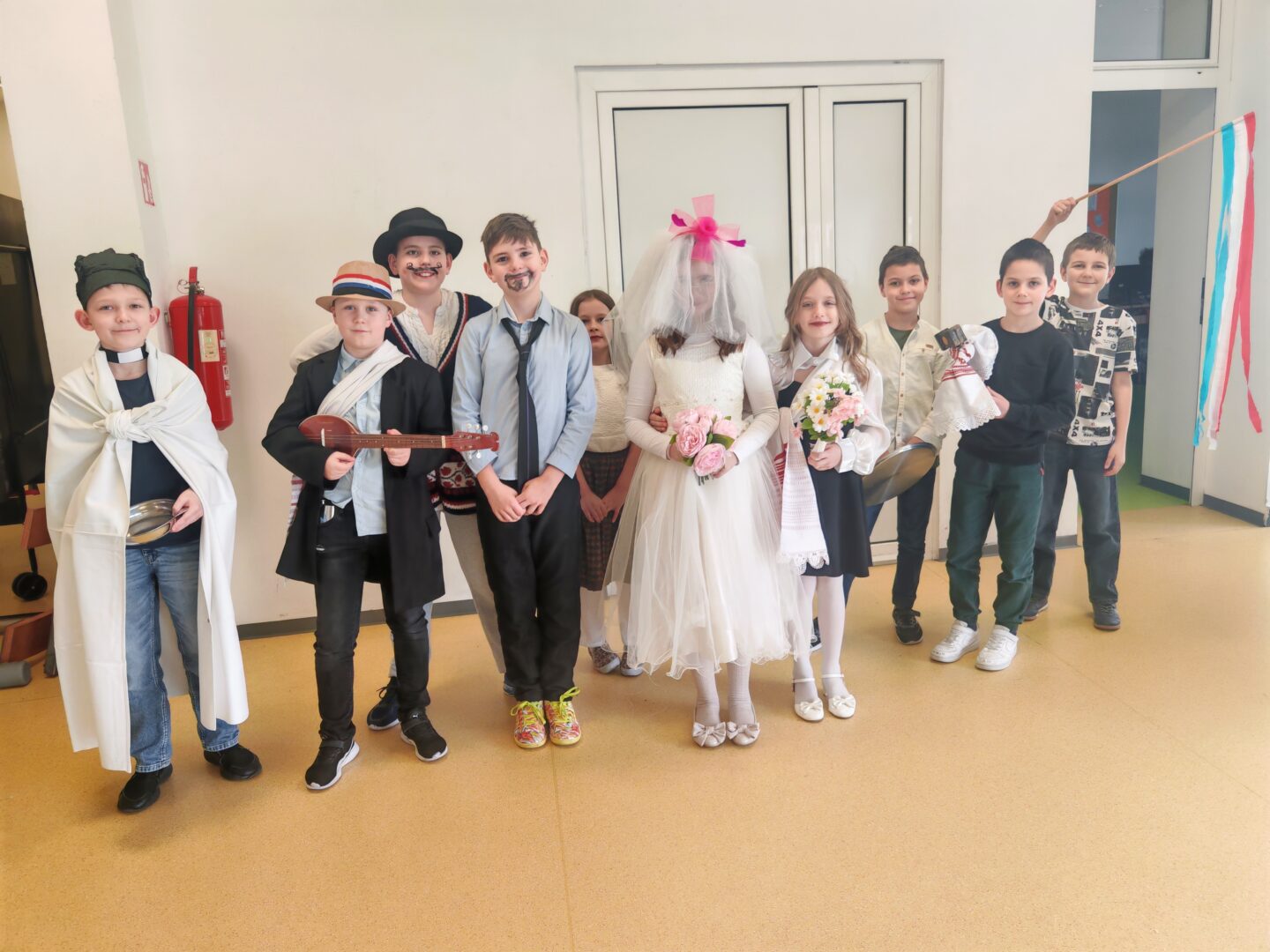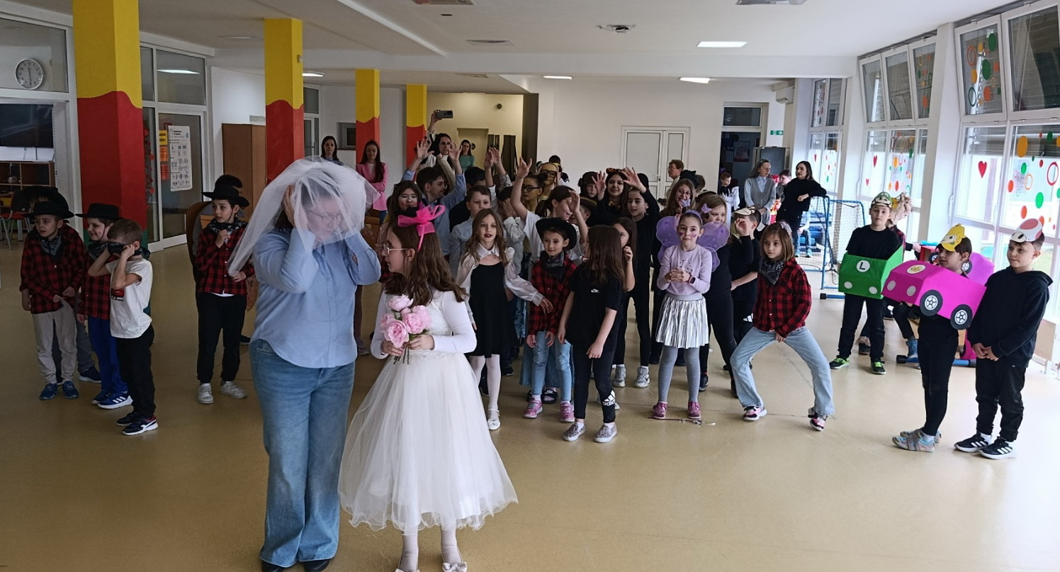 Posebno su se istaknule skupne maske – kauboji, Super Mario Kart ekipa, pizze, Minioni, pa čak i pravi slavonski svatovi (!!!) – koje su privukle pažnju i oduševljenje sudionika. Uz njih su nas posjetili i brojni zanimljivi likovi: vatrogasci, policajci, vesela pčela, vile, pjevači, lopovi i leopardi. Svaki je kostim imao svoju priču, a školski hol je postao prava mala pozornica.