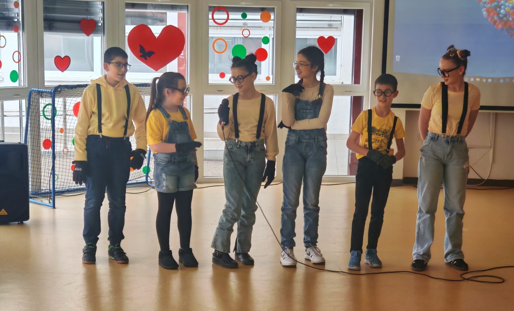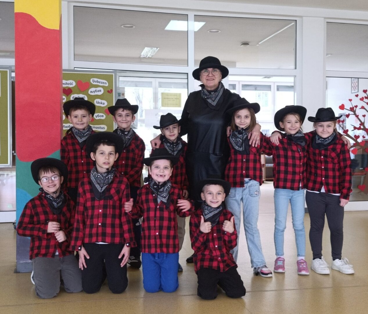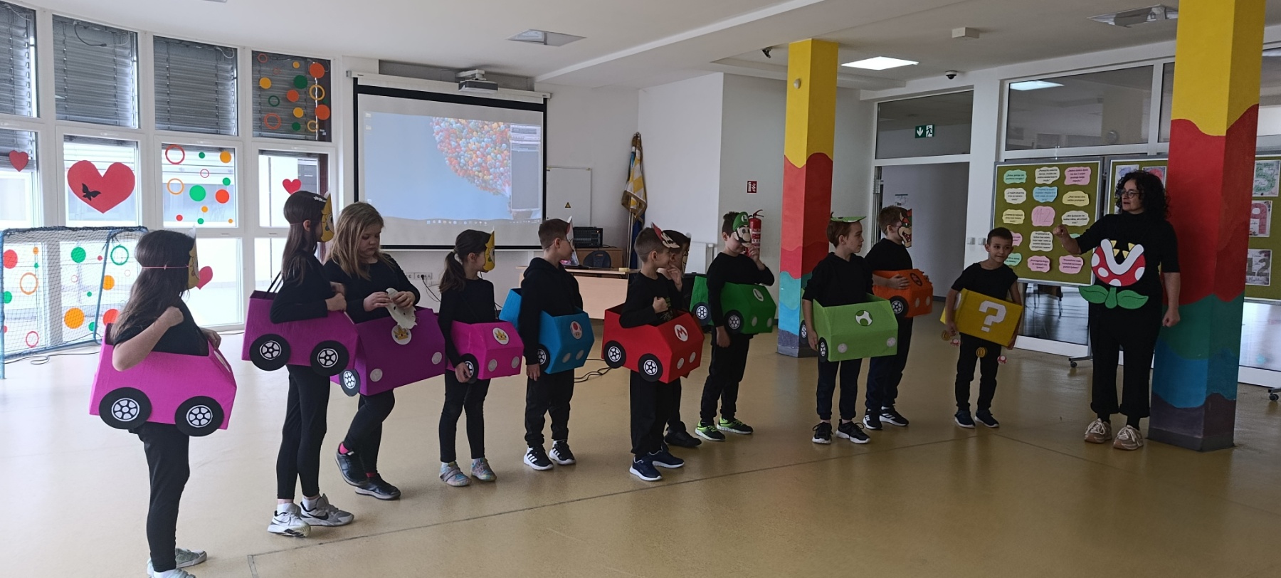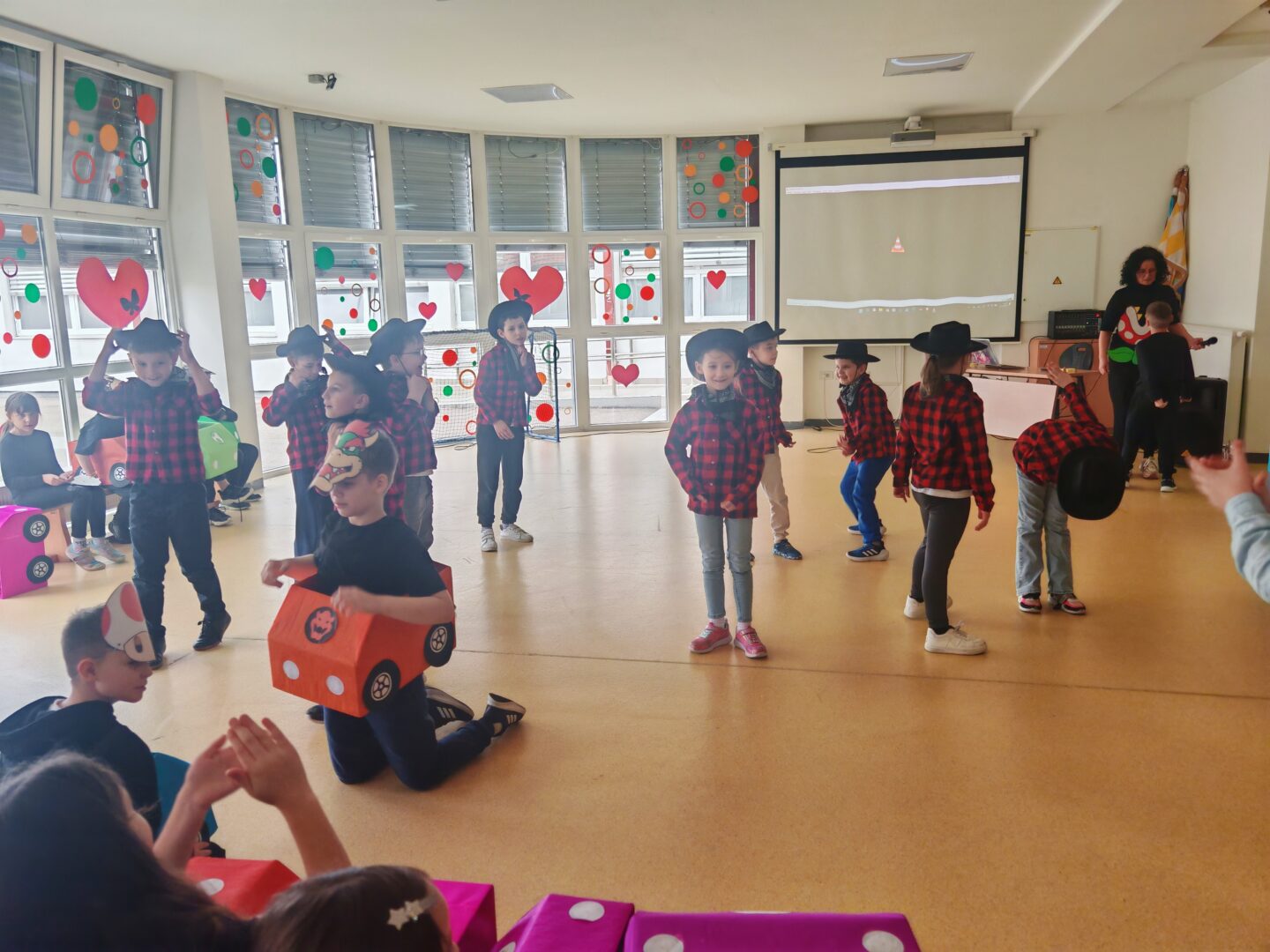 Posebno su se istaknule skupne maske – kauboji, Super Mario Kart ekipa, pizze, Minioni, pa čak i pravi slavonski svatovi (!!!) – koje su privukle pažnju i oduševljenje sudionika. Uz njih su nas posjetili i brojni zanimljivi likovi: vatrogasci, policajci, vesela pčela, vile, pjevači, lopovi i leopardi. Svaki je kostim imao svoju priču, a školski hol je postao prava mala pozornica.