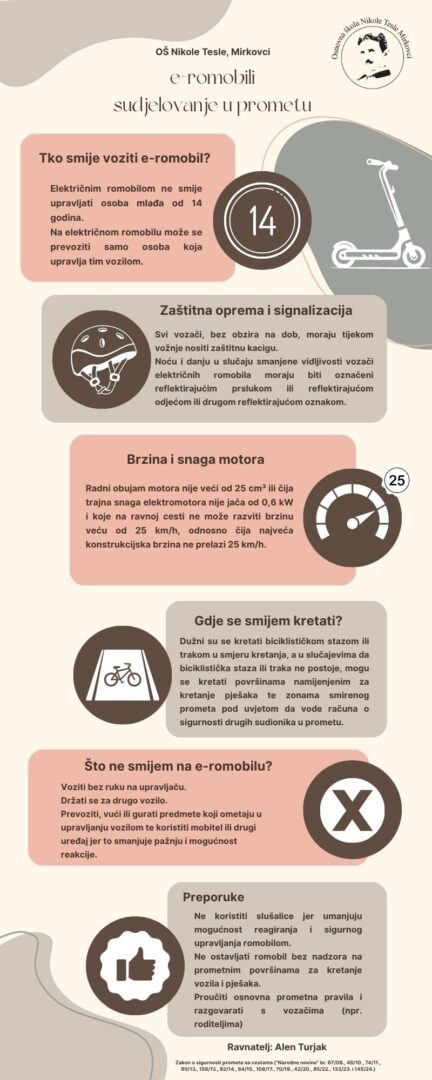 Ovdje naglašavamo i da vozači e-romobila mogu biti djeca s navršenih 14 godina te da se trebaju pridržavati svih sigurnosnih i zakonskih uputa. Cilj nam je potaknuti naše starije učenike na sigurno i odgovorno sudjelovanje u prometu čime možemo prevenirati mnoge neželjene posljedice.